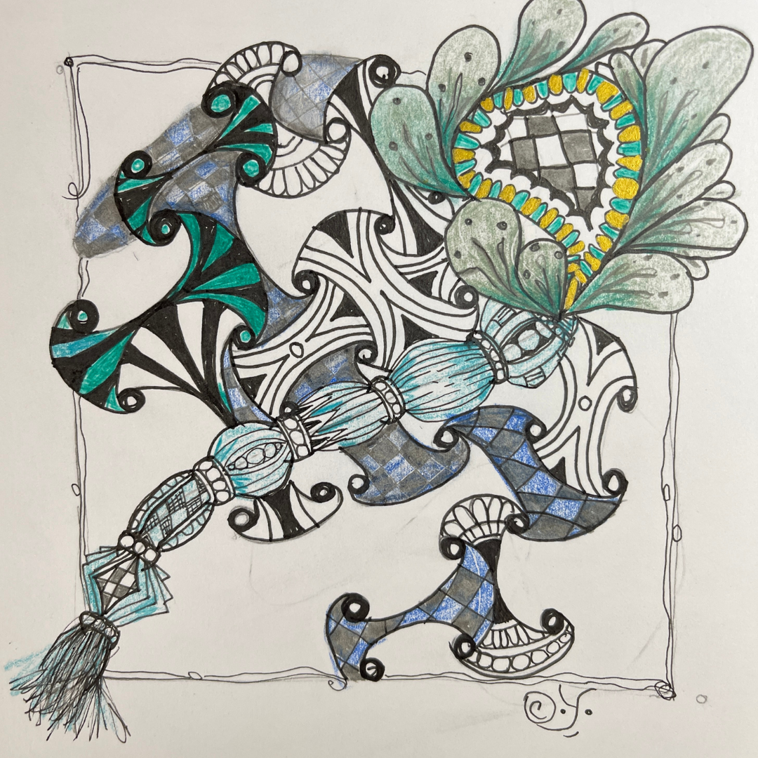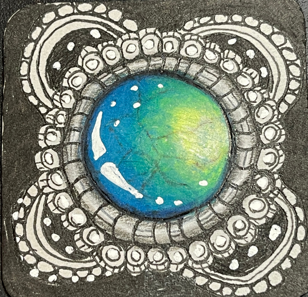 💎 Turquoise Zen stone Tangle: Inspired by the upcoming Albuquerque Spring Powwow, we’ll create a turquoise gemstone tile using Inktense and colored pencils, then embellish it with a simple Zentangle-inspired necklace design.